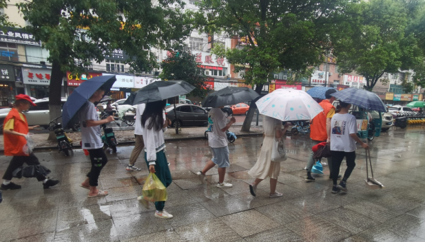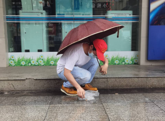 雨点阵阵,挡不住的是志愿者火热的心。当志愿者准备出发之际,正是雨势最大之时。他们在风华园前集合前往校门口街道,冒着风雨,提着扫帚,清扫街边垃圾。分小队,分区域,一人扫地,一人打伞,默契合作,仔细地打扫街道。水中的落叶被清扫得干干净净,浸湿的烟头被一个一个捡起……